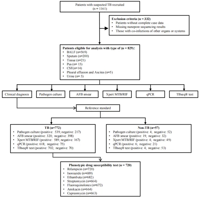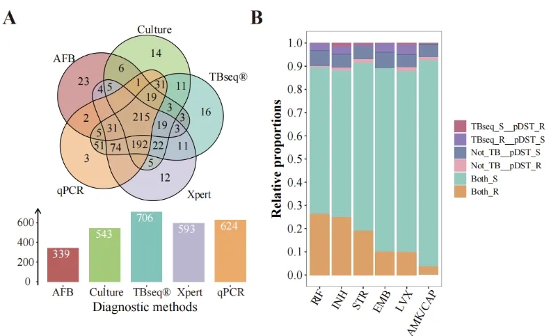 本研究招募了來自6家結(jié)核病定點(diǎn)醫(yī)院的1161例疑似結(jié)核病患者,經(jīng)篩選后納入829例進(jìn)行后續(xù)分析。通過對(duì)比M.tb培養(yǎng)、AFB涂片、Xpert MTB/RIF Ultra、qPCR及TBseq®五種診斷方法的性能,以臨床診斷為金標(biāo)準(zhǔn),評(píng)估其診斷準(zhǔn)確性。同時(shí),對(duì)720例結(jié)核患者進(jìn)行pDST,驗(yàn)證TBseq®在耐藥性預(yù)測(cè)中的表現(xiàn) (Figure 1)。