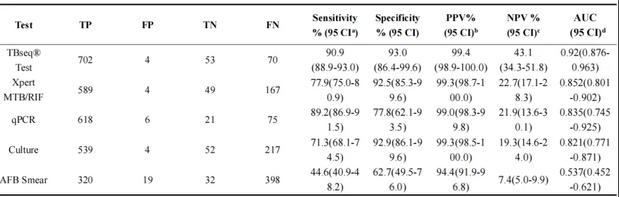 Table 1 不同檢測(cè)方法的結(jié)核病診斷性能
